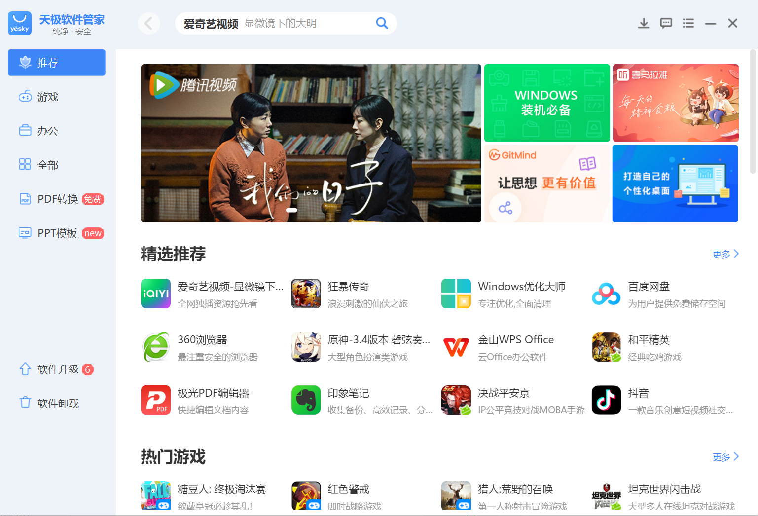 软件覆盖全面 天极软件管家整合丰富的PC软件资源,涵盖系统办公、社交、游戏、娱乐,便捷工具等分类,为用户提供海量软件库。